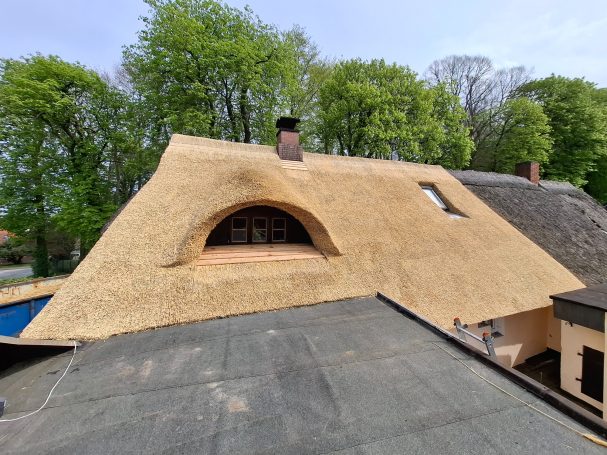 Die Eindeckung erfolgt selbstverständlich nach den Fachregeln für Reet und mit ausgesuchtem Material, welches dem Produktdatenblatt entspricht